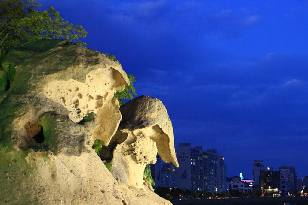 반사되는 노을빛이 아름다운 목포 관광 보물 – 천연기념물 제500호로 지정된 갓바위는 두 사람이 나란히 삿갓을 쓰고 서 있는 모습의 바위로 약 8천만년전 화산재가 굳어진 용결응회암이다.예전에는 배를 타고 나가야만 볼 수 있었던 갓바위를 해상에서 직접 조망할 수 있는 보행교를 바다위에 설치하여 더욱 가까이에서 볼 수 있다.